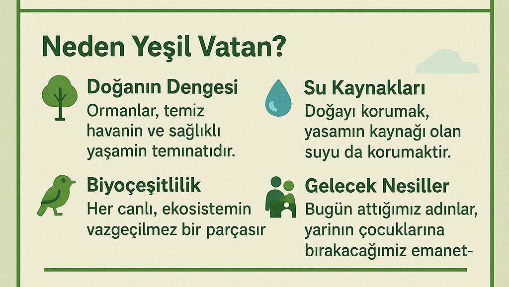 Doğa, bize miras bırakılan en kıymetli hazinedir. “Yeşil Vatan” anlayışı, doğayı korumayı sadece bir görev değil, aynı zamanda bir yaşam biçimi olarak benimser.
